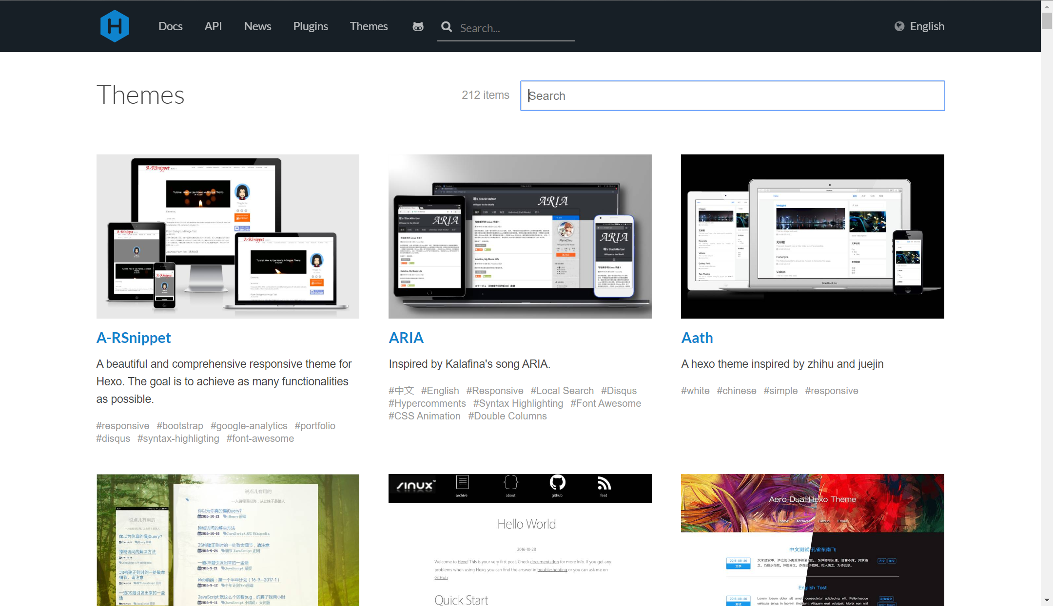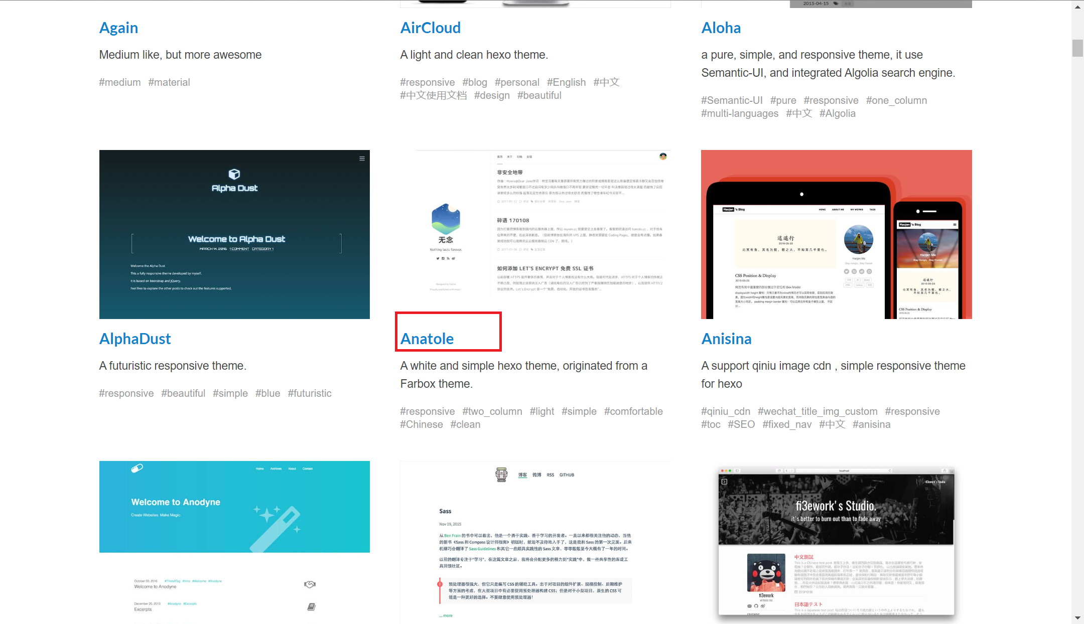 Hexo的主题有很多,大家可以访问 https://hexo.io/themes/ 来挑选,点击图片可以看到demo,部分需要科学上网,选择一个你喜欢的,现在主流的是用Next主题,我们这里将会用Anatole 主题来做演示,后续也会写Anatole的细节修改步骤;